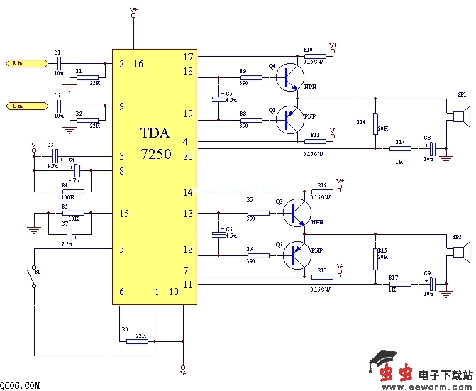 从以上电路可以看出TDA7250的过流保护原理是检测电阻R11、R12、R13、R14的电压。当晶体管的过流时,根据U=I?R,得出电阻的端电压随之增加,到达一定的电压后,TDA7250就将晶体管基极的电压置零,从而达到晶体管过流保护的作用。电阻R14、R15、R16、R17为负反馈回路,整个电路的增益由R14、R15和R16、R17的比值决定,公式GV=1+R14/R16或者GV=1+R15/R17。