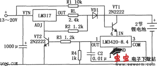 本电路采用了LM3420-8.4专用锂电池充电器,电路简单,性能优良,能对两节锂电池进行快速充电。当充电电压到达额定值(单节锂电池为4.2V)时,充电电流下降到涓流充电,以免超压充电对锂电池造成永久性损坏。