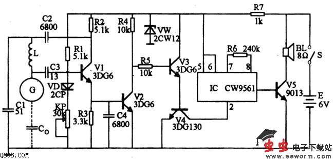 V1、V2、V3采用3DG6等,B为80~150;V4采用3DG130、3DG12或3DK4等。V5采用9013等。集成电路IC选用CW 9561四声IC。VD1为2CP型M极管,Vw为2CW12稳压二极管。I用0.31mm的漆包线在外径为10MM的有机玻璃管上密绕20匝即成。感应器G用200X150mm的金属板制成,或将G点引线与金属门锁相连。
