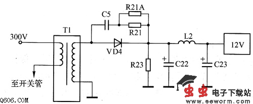 12V电压不稳定,应先检查开关电源的输出部分,如图所示。检查开关变压器的二次绕组及VD4均正常,电感L2无虚焊现象。滤波电容C22和C23的参数都是1000pF/16V,用电容表测量C23,基本正常(容量略有下降),但C22容量却下降到不足80μF,将C22、C23同 分析原因是该机的主电源安装在显示器的底座内,空间很小,散热不良,而C22、C23均靠近12V整流二极管(特别是C22离得更近),受到烘烤后容量下降,使12V的带负载能力变差,进而出现这种故障。虽然5V和3.3V源自于12V,但12V的不稳定并未下降到5V和3.3V变换器的极限供电电压以下,所以这两个电压一直正常,因而掩盖了故障的本质。