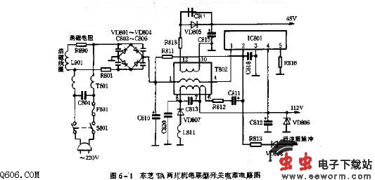 如图所示是东芝TA两片机串联型开关电源电路。它由厚膜电路IC801、开关变压器T802及外围元件构成。220V市电经开关S801、保险丝F801及由C801、滤波线圈T801构成的电源滤波电路,加到VD801-VD804桥式整流电路进行整流,由滤波后获得约300V不稳定的直流电压,经开关变压器T802(1)-(4)绕组至IC801中开关管VT1C极。同时由启动电阻R811向VT1的b极提供一个启动电流,使开关管VT1导通,有电流流过T802(1)-(4)绕组,在T802次级绕组上产生感应电压。T802(6)-(8)绕组为正反馈,其产生的感应电压经R812、C811加在VT1的b、e结上,在强烈的正反馈作用下,VT1迅速进入饱和导通状态。