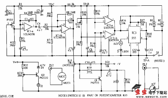 IC3的输出驱动串联的BZ1和LED1.当电路探测到目标时,LED1亮、BZ1发声,其持续时间取决于R17、R18、C13的数值。红外光断续器的马达控制电路由Q2和电位器R23组成。稳压二极管D1提供正的导通信号,直流驱动信号经插口J2和插口PL2送到光断续器马达MOT1,后者是0-12V低转矩慢速直流马达。整个电路由B1、B2两块电池供电。电源开关S1和电位器R15是同轴联动的。