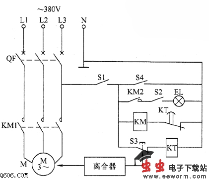 当缝纫工人继续工作时,再踏动离合器踏板,使S3断开,KT断电复位,KM通电吸合,M起动运转,又开始缝纫工作。