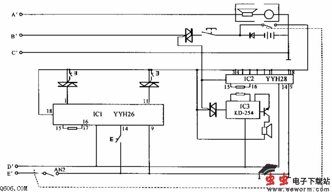 内线电话电路如下图所示,将一种玩具电话机稍加改进,即可变实用的内线电话。本电话机由电话组件、编解码电路和振铃电路等部分组成。用元件参数完全相同的两部以上电话机,由导线连接,即可构成内线电话。