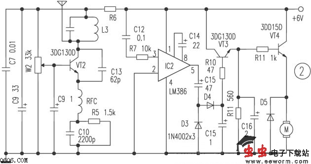 图2所示为接收驱动电路,为简化接收电路,由VT2及其外围元件构成超再生检波器,检出原方波调制信号,经C12、R7送至IC2的③脚,放大后的信号经D3、D4倍压整流,由VT3射随器输出其平滑后的直流电压。该电压的大小与发送的不同占空比信号波形有关。占空比大,电压高,经R11为VT4提供的偏置电流大,电机的转速高;反之,电机转速慢。当占空比足够小时,VT3截止无输出,VT4因失去偏置而不导通,电机停转,由此可得电机转速与占空比成正比关系。
