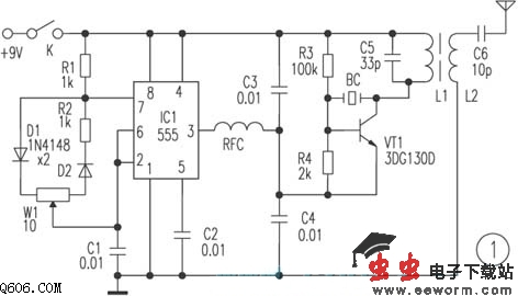 元件选择 L1可用10K型中周骨架,用∮0.15mm高强度漆包线绕9匝,L2在L1的外层用同型号漆包线绕3匝,不用屏蔽罩,但需旋入磁芯;L3的制作同L1;BC用JA12等金属壳谐振器,频率在27~29.8MHz之间均可;3DG130D型NPN三极管,β>100,RFC用18μH色码电感。
