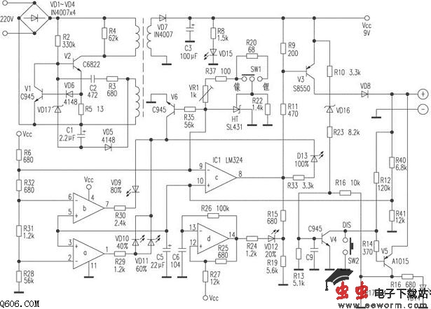 该充电器采用了RCC型开关电源,即振荡抑制型变换器,它与PWM型开关电源有一定的区别。PWM型开关电源由独立的取样误差放大器和直流放大器组成脉宽调制系统;而RCC型开关电源只是由稳压器组成电平开关,控制过程为振荡状态和抑制状态。由于PWM型开关电源中的开关管总是周期性的通断,系统控制只是改变每个周期的脉冲宽度,而RCC型开关电源的控制过程并非线性连续变化,它只有两个状态:当开关电源输出电压超过额定值时,脉冲控制器输出低电平,开关管截止;当开关电源输出电压低于额定值时,脉冲控制器输出高电平,开关管导通。当负载电流减小时,滤波电容放电时间延长,输出电压不会很快降低,开关管处于截止状态,直到输出电压降低到额定值以下,开关管才会再次导通。开关管的截止时间取决于负载电流的大小。开关管的导通/截止由电平开关从输出电压取样进行控制。因此这种电源也称非周期性开关电源。 220V市电经VD1~VD4桥式整流后在V2的集电极上形成一个300V左右的直流电压。由V2和开关变压器组成间歇振荡器。开机后,300V直流电压经过变压器初级加到V2的集电极,同时该电压还经启动电阻R2为V2的基极提供一个偏置电压。由于正反馈作用,V2 Ic迅速上升而饱和,在V2进入截止期间,开关变压器次级绕组产生的感应电压使VD7导通,向负载输出一个9V左右的直流电压。开关变压器的反馈绕组产生的感应脉冲经VD5整流、C1滤波后产生一个与振荡脉冲个数呈正比的直流电压。此电压若超过稳压管VD17的稳压值,VD17便导通,此负极性整流电压便加在V2的基极,使其迅速截止。V2的截止时间与其输出电压呈反比。VD17的导通/截止直接受电网电压和负载的影响。电网电压越低或负载电流越大,VD17的导通时间越短,V2的导通时间越长,反之,电网电压越高或负载电流越小,VD5的整流电压越高,VD17的导通时间越长,V2的导通时间越短。V1是过流保护管,R5是V2 Ie的取样电阻。当V2 Ie过大时,R5上的电压降使V1导通,V2截止,可有效消除开机瞬间的冲击电流,同时对VD17的控制功能也是一种补偿。VD17以电压取样来控制V2的振荡时间,而V1是以电流取样来控制V2振荡时间的。 如果是为镍镉、镍氢电池充电,由于这类电池存在一定的记忆效应,需不定时对其进行放电。SW1是镍镉、镍氢、锂离子电池充电转换开关。SW1与精密基准电源SL431为运放LM324⑨提供两个不同的精密基准源,由SW1切换。在给镍镉、镍氢电池充电时,LM324⑨脚的基准电压约0.09V(空载);在给锂离子电池充电时,LM324⑨脚的基准电压约为0.08V(空载),这种设计是由这两种类型电池特有的化学特性决定的。按下SW2,V5基极瞬间得一低电平而导通,可充电池上的残余电压通过V5的ec极在R17上放电,同时放电指示灯VD14点亮。在按下SW2后会随即释放,这时可充电池上的残余电压通过R16、R13分压,C9滤波后为V4的基极提供一个高电平,V4导通,这相当于短接SW2。随着放电时间的延长,可充电池上的残余电压也越来越低,当V4基极上的电压不能维持其继续导通时,V4截止,放电终止,充电器随即转入充电状态。