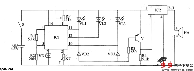当环境温度升高时,RT的阻值随之减小,使IC1的2脚电压下降。当温度偏高使IC1的2脚和4脚变为低电平时,10脚和12脚输出低电平,使VL2和VL3点亮,VD3和V导通,IC2也导通工作,HA发出报警声。