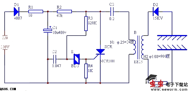 调整R3的阻值可以改变触发频率和输出电压。调整时必须注意安全,更换元件需拨下电源插头。