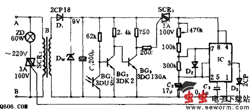 本电路适用于施工现场的安全信号灯。在施工现场将A、B两端点并入220V的市电经变压器B降压,二极管D1,Dw整流、C1滤波,给光电天关提供约9V的直流电。Dw起整流和稳压双重作用。白天在强光的作用下,光电开关阻断,SCR1无触发电流而处于断态,红色信号指示灯ZD不亮。肖夜幕降临时,光电开关处于通态,IC等组成的振荡的高电平电路开始工作,IC的3不断输出超频矩开脉冲,SCR2在此脉冲的高电平下导通,在低电平下截止,因此可看到信号灯一闪一闪地发光。