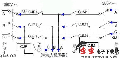 两路供电系统,一般都有人工转换控制,但是,由于山高气候恶劣,停电现象时有发生,值班人员又远离供电室100余米,突然停某一路电时,人工倒电时间长,劳动强度大,机房内电视发射机和三套调频广播发射停播,影响播出。本自动换电装置能在某一路市电突然停电时,在1/10s内自动转换供电,使正常播出质量不受影响。整个装置和电力稳压器(250KVA)配合,在原配电盘上只需增加2只200A交流接触器,经济效益明显,本装置采用后,机房供电和播出质量都大大提高。 1.供电开始 三相闸刀开关KM开、KP合,交流接触器CJM的常闭触点使交流接触器CJP得电,主触点CJP1吸合,由外电1供电,此时CJP的常闭触点CJP2断开,再合KM,外电2等待。 2.转换供电 外电1突然停电时,CJP失电,其主触点CJP1断开,辅助触点CJP2闭合,CJM得电,主触点CJM1闭合,由外电2供电,此时常闭触点CJM2断开,外电1恢复后等待。 3.人工转换供电 工作需要某一路市电供电时,只需将另一路闸刀拉开,而外电1、外电2则由人工切换。 4.KP、KM为600A三相闸刀开关,CJP、CJM为200A交流接触器。