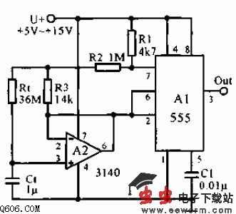 微秒到1小时定时器电路如下图所示,该电路采用高输入电阻场效应管输入级运算放大器3140,可使555定时器定时范围增加到100倍。选择比值R3/R2,可以改变倍增系数。延迟时间T=[(R2+R3)/R2](1386R1C1),图中参数T=100R1C1=1小时。