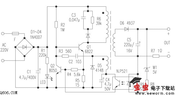 拆开充电器,根据实物绘出的电原理图如附图所示。接入市电测充电器输出电压5V左右,但是其电压在慢慢地降低。故怀疑某元件性能不良。遂换掉开关管、光电耦合器及Q2,故障依旧。然后通电测试Q1基极电压,其值从0.4V降到0V,怀疑启动电阻R2开路,测其阻值,果然已是无穷大。更换该电阻后,故障排除。