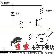 用分立器件搭建一个线性恒流器相对简单。图1就是一款用分立器件搭建的恒流器。D1应是支齐纳二极管或电压参考。电流则由方程ILED=VD1/RSET确定。D2提供对晶体管基极二极管的简单温度补偿。