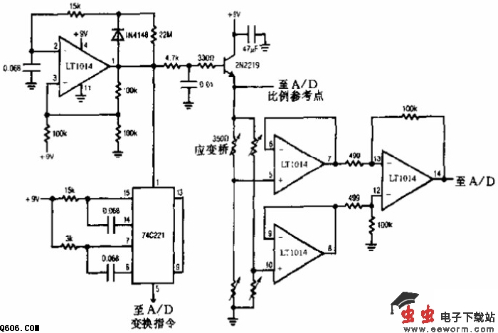 9V电池应变计信号调节电路图如图所示,采样电路给出低平均工作电流650uA,由于V/T高阶跃变化,4.7K和0.01uF可以构成的RC网络用于保护应变桥,防止长期漂移。