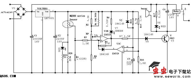 一个简单的酒后驾车自动保护系统图,利用酒精传感器的含有酒精气体检测装置,当在车内检测到酒精浓度超过标准,电路中继电器动作,切断汽车发动机,使汽车不能开动。如图5, 此电路控制简单,缺点只要车内酒精浓度超标则会动作,所以应用存在局限性,如出租车就不适合。