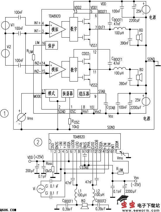 图2为TDA8920组成的单声道100W桥接负载(BTL)功放电路。