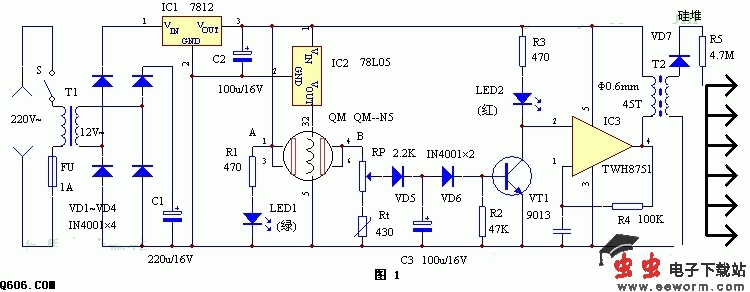 电路分为两个部分,以QM-N5为中心元件的电路组成空气检测开关电路,它可以检测可燃气体。当空气有有害气体达到一定浓度时,由于B点电位升高使VT1饱和导通,起到了检测开关的作用。Rt为负温度系数热敏电阻,用来补偿QM-N5由于温度变化引起的偏差。以TWH8751为中心器件的电路组成负氧离子发生器,其振荡约为1KHz,在T2次级可得到5KV左右的高压。放电端采用开放式,大大提高了负氧离子的浓度,减小子臭氧的浓度,使到达外面的负氧离子增加,TWH8751的2脚即同相输入端为高电位时,振荡器停振,在正常的室内环境下,A、B之间电阻很大,B点电位很低,VT1截止,TWH8751的2脚为高电位,振荡器不工作,没有负离子产生;当室内的有害气体浓度超过了RP设定的临界值,VT1饱和导通,TWH8751的2脚呈低电位,振荡器起振,产生负离子。在一定程度上负离子可以消除室的烟雾,达到清新空气利于身体健康的目的。