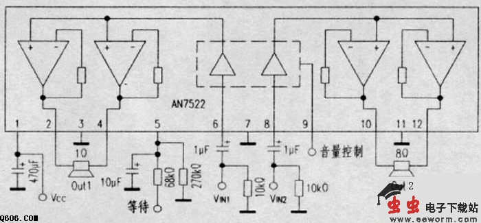 概述 AN7522是日本松下公司生产的用于立体声系统伴音功放集成电路,输出功率3W/8欧姆,具有待机功能以及静态功耗小、噪声低、外围元件少、工作稳定等特点。主要用于电视、音响和个人电脑。