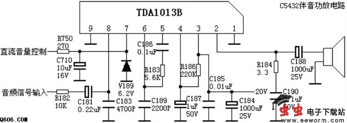 TDA1013引脚功能及参考电压:1脚:0V—地 2脚:7.7V—伴音输出 3脚:16V—电源 4脚:13.5V—电源5脚:0.3V—功放输入 6脚:6.7V—前置输出 7脚:2.8V—音量控制 8脚:1.9V—音频输入 9脚:0V—地。