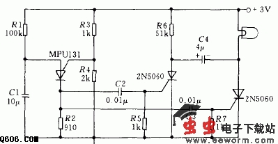 MPU131是程控晶闸管,配合R1、C1组成弛张振荡电路,其输出分别控制两个单身晶闸管2N5060,从而可使低压(2V)指示发出定时闪光。