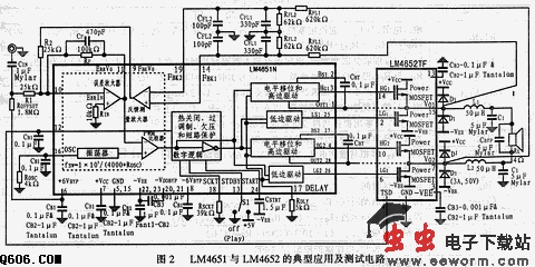 使用用美国国家半导体公司(NSC)推出的LM4651/LM4652 Overture TM最新IC和很少的外部元件,即可组成170W高效D类音频功率放大器。LM4651的PWM驱动器与LM4652半桥(H-bridge)功率MOSFET IC所构成的这种简单紧凑的D类超低音(Subwoofer)放大器完全解决了通常仅在AB类放大器中才能看到的保护问题,但效率比AB类放大器有较大提高,而散热器尺寸则比功率电平相同的AB类放大器有所减小,LM4651与LM4652被应用在家庭影院和PC自动(Powered)超低音放大器、汽车音响增强(booster)放大器和自供是(self-powered)扬声器等方面,会取得令人满意的效果。