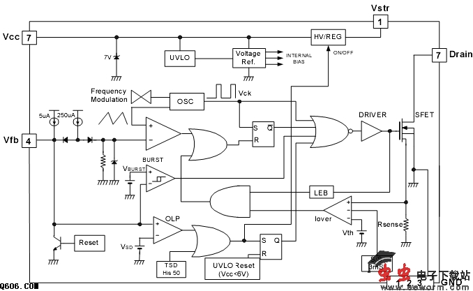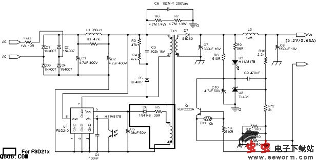 小功率单片开关电源模块FSD200,它在230V±15%时输出功率为7W,双列直插封装,价格低廉,外围线路十分简单。FSD200有这样一些显著特点:①开关频率能在4ms内从130KHz变到138KHz,这种将开关频率在一定波段内抖动的方法,可将谐波能量分散,有效抑制采用固定开关频率带来的高次谐波所产生的干扰。这不仅减少了EMI,而且可用低成本的电感来代替开关电源通常使用的进线滤波器。②不需反馈绕组。FSD200通过与直流母线相连的Vstr引脚,将外部高压送入内部的高压调节器Hvreg变到7V,作为芯片的控制电压,省去了反馈绕组。其他还有过负荷保护、过热关断、软起动、在待机状态时减少开关损耗的自举操作方式等。