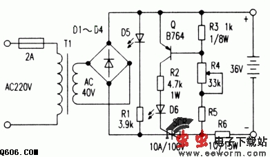 36V电动车充电器电路图,些充电器是用传统线性变压器制作,能效低,但制作成本低,寿命长。