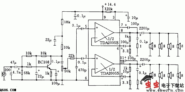 20W公共汽车收音机和扩音机电路采用TDA2005S双低频功率放大集成电路设计,前端输入端可以接话筒或收音机的低频电压放大输出级,每个TDA200S输出10W功率,可带4个扬声器。两路输出可带8个扬声器,可分放在车内不同地方,总输出功率可达20W。