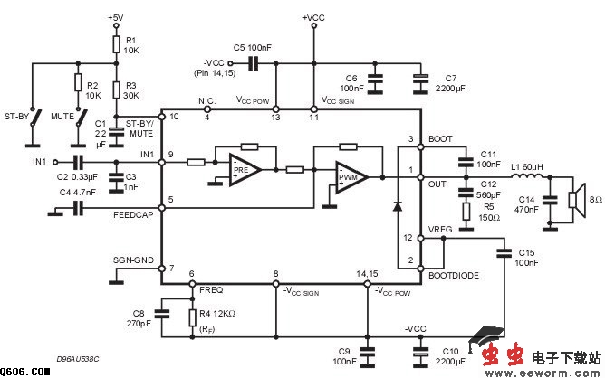 SGS-THOMSON公司推出了三款单片D类功放IC,他们分别是TDA7480(10W)、TDA 7481C (18W)和TDA7482(25W)。本文以输出功率最大的TDA7482为例加以介绍。
