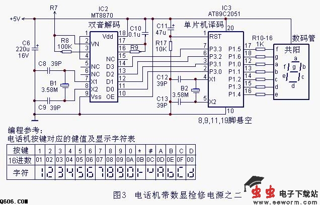 图是针对 74LS247 的不足而改用单片机来译码的电路图(局部)。除了 *,# 两个符号数码管无法显示外,其他显示都与按键相对应。*,# 两个健的显示符号自定见列表。由于 MT8870 输出的0,*,#,A,B,C,D 字符信号与计算机的16进制数数码不一致,编程时要注意,请参见列表。
