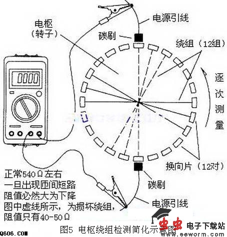 对电机绕组检测可用多种手段。本文介绍一种最简单、最方便的检测方法,供同行参考。如图5所示。断开电机与外部连线,将表笔夹分别夹在碳刷后面的引线上,用手转动电机轴,逐次测出每对换向片之间电阻值,正常阻值约为540 Ω左右,如果阻值降为50 Ω 以下,说明连接在这一对换向片之间的绕组己被烧毁或己被击穿,出现匝间短路。图5为简化的示意图,将换向片间相对应的绕组用一条圆的直径表示(用虚线直径表示被烧毁的绕组)。用此法检测,不需要拆开电机,就能够迅速判断电机是否损坏。