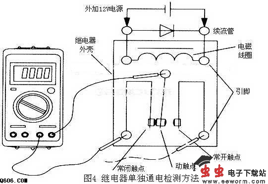 由于豆浆机工作时离不开水和蒸汽,所以机头进水,部件受潮、发霉,用户稍不注意就会发生,对继电器造成威胁。而且继电器自身电流负载很大、转换频繁,因此很容易将触点烧坏,使豆浆机无法工作。同样,在整机带电条件下,对继电器检测很困难,为此笔者采取对继电器单独通电法进行检测,如图4所示。外加一个DC12 V电源,注意将该电源正极接在续流二极管负极上,负极接在续流二极管正极上,接通或断开外加电源,应该听到继电器吸合与释放动作发出的声响,而且测量常开或常闭触点,应该有接通或断开相应的反映。如果继电器无动作反映,表明继电器电磁线圈有问题,对于图2所示电路,正常情况K1、K3电磁线圈阻值为380 Ω,K2为190 Ω。如果无相应的接通或断开反映,说明这是触点己被烧坏的缘故。