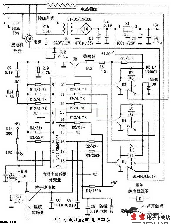 图2所示。为九阳经典机型电路图,具有广泛的代表性。一般豆浆机的预热、打浆、煮浆等全自动化过程,都是通过 MCU有关脚控制,相应三极管驱动,再由多个继电器组成的继电器组实施电路转换来完成。只要掌握这一条基本规律,就可对所有机型的豆浆机进行电路检查,排除各类故障。但是,有些机型电路板的制作有点问题,它是将元件的编号压在元件下面的,因此在电路板上只能看到元件,而看不到元件编号,这样对于电路的检测极不方便。为此,本文给出图3所示。图中将各元件编号,一一标出。