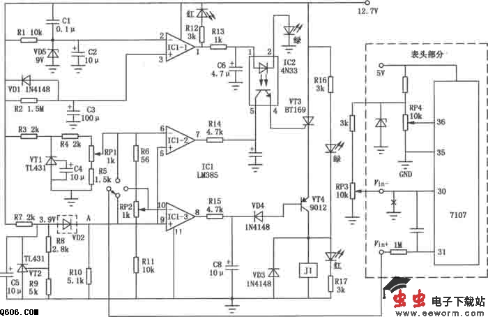 电子温控器电路原理如图所示。ICl为集成运算放大器5G058,其中运放ICl-1接成延时电路,ICl-2、ICl-3接成窗口电压比较器。VD2为温度传感器,它由5只二极管1N4148串联而成。由图可见,A点电位将随传感器VD2所测到的温度呈正比变化。温度每升高1℃,VD2的正向压降减小约12mV。电位器RPl设定上限温度值(压缩机启动),电位器RP2设定下限温度值(压缩机停止),两者之间为温差,最小温差可调到0.5℃。延时电路与比较器输出端用IC2光电耦合器隔离,可提高电路的可靠性。温度显示表头选用μP5135A型(表头部分见图中虚线框内)。由于本电路传感器VD2的负端即A点电位设计成1V为0℃,而表头为0V显示“00.0”,因此电路中加入3kΩ电阻和电位器RP3,并将表头集成电路7170的30脚接地线(图中打×处)断开,使表头的Vin端的电位提高1V。 调试时将传感器VD2置于冰水混合物中,调电位器RP3使表头显示“00.0”,再把VD2放入沸水中,调电位器RP4使表头显示为“100.0”,调试即告结束。最后,按电冰箱冷藏室内所储存的食物设定好温度、温差就可投入使用了。