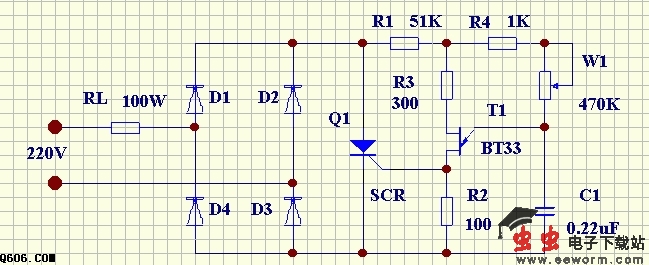 调压器的调节电位器选用阻值为470KΩ的WH114-1型合成碳膜电位器,这种电位器可以直接焊在电路板上,电阻除R1要用功率为1W的金属膜电阻外,其佘的都用功率为1/8W的碳膜电阻。D1—D4选用反向击穿电压大于300V、最大整流电流大于0.3A的硅整流二极管,如2CZ21B、2CZ83E、2DP3B等。SCR选用正向与反向电压大于300V、额定平均电流大于1A的可控硅整流器件,如国产3CT系例。