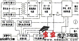 此电路由IC2、Q2、Q5、T1等组成。其作用是将蓄电池12V电源通过PWM、开关变压器T1升压到高频率220V电源。高频率220V电源电压的高低由取样电路R10、R11、R12、R64、R56及IC21、9脚等控制;IC2工作与否,由IC126脚通过IC2的10脚进行控制。IC2的振荡频率为:f=1/[C28(0.7R59+3R42)],实测频率为64KHz左右。