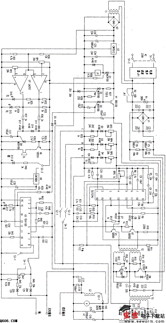 U7、RPl、RP2等组成交流过、欠压保护。由U2整流后的不稳定直流电压,经R30、R31分压后输入到电压比较器LM293的③和⑥脚,由U3稳压后的12V电压经RPl、 RP2分压后,分别输入到LM293的②脚和⑤脚,当③脚电压高于RP1设定值时,①脚输出高电位,通过R35驱动 D16发光,指示交流过压;经R36、Dll、D5,触发可控硅 Q3导通,使V1截止,SGl524J无供电输出,达到保护的目的;另一路经D14触发可控硅Q4导通,使V6导通,DL发出报警声。当⑥脚电压低于RP2设定值时,⑦脚输出高电平,通过R34驱动D15发光,指示交流欠压;经R37、 D17触发可控硅Q4,实现欠压报警,但欠压不截断输出,仍可工作。