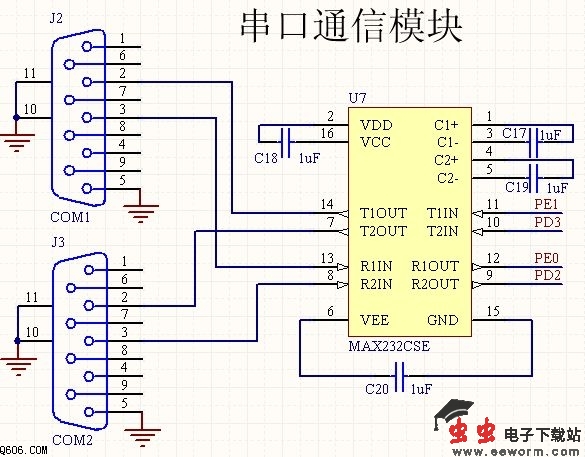 在MAX232的数据手册中,有这个芯片的典型连接电路,我们直接采用这种电路即可。关于MAX232的连接电路,其实非常简单,我们只要记住4电容(或5电容)就可以了。这里的4电容指的是电路中只需要连接4个电容就可以;至于5电容,多出来的那个电容是连接VCC和GND之间的电容,这个电容可以不接,但是从考虑电源的稳定性上来说,建议接上。