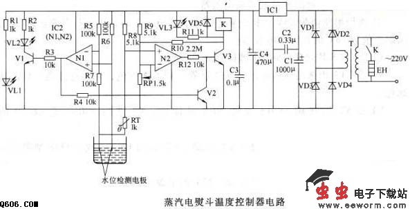 该蒸汽电熨斗温度控制器电路由电源电路、水位检测电路、温度检测电路