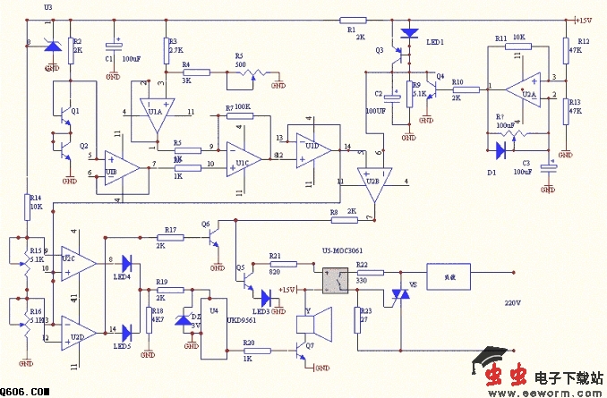 Q1、Q2的be结串联作为温度传感器,由精密稳压集成电路U3(TL431)提供约2.5V的高稳定基准电压源为传感器及窗口电压比较器(U2C,U2D)和差分放大器(U1C)提供合适的参考基准输入。U1A,U1B的接入是为了便于调试并使差分放大器的输入阻抗尽可能平衡。电压跟巡器U1D起缓冲隔离作用,分别将经U1C差分放大器放大后的温差电压Vd送到电压比较器U2B的同相输入端上,U2C的反相输入端接在由U2A等组成的锯齿波电压发生器的输出端上,在锯齿波电压低于Vd期间,U2B输出高电平,Q5饱和导通使接口电路U5得到输入电流信号,其输出端触发双向可控硅VS在市电过零时导通。负载得电工作而发热。培养箱内温度升高,LED3为一绿色高亮度发光二极管,其作用有三:1,作为加热工作状态指示灯用; 2,防止电路可能出现误动作; 3,为抵消因Q6可能出现的饱和压降过大而使Q5在超温时不能可靠的截止。因负载得电工作发热,培养箱内温度升高,与设定点的温度差减小,从而引起U1C输入的差分电压变小,U1C输出变小,U1D输出(Vd)亦变小,(在一个锯齿波周期内)U2B输出高电平时间减少,以致于培养箱内温度上升速度减慢,当培养箱内温度达到设定温度(37℃)时,此时,温差最小,Vd此时亦最小,负载得电时间最短。以致于培养箱内温度基本上无变化,负载所发热量与培养箱与环境热交换所散发的热量相当,从而维持培养箱内温度稳定在设定温度上。由于负载工作时间长短与温差密切相关(温差大时,Vd大负载得电工作时间就长产热量多,反之,负载工作时间就少,产热也少),而且传感器的输出经约100倍放大从而使得本电路的灵敏度和控制精度都比较高。基本上没有明显的温度阶跃。U2C,U2D为一窗口电压比较器,当培养箱内温度低于设定的报警下限温度时,U2C输出高电平,黄色发光二极管LED4被点亮,表示欠温状态,同时为报警声源集成电路U4提供工作电源使U4工作输出音频信号经Q7放大推动扬声器发声报警;而当某种原因使电路失控而致培养箱内温度升高超过设定报警温度的上限温度时,U2D输出高电平,一路使红色发光二极管LED5发光指示出超温状态,并为报警电路供电是扬声器发声报警;与此同时,经R17使Q6饱和导通,迫使Q5截止,切断U5的输入电流,使VS关断。负载失电停止工作以防培养箱内温度继续升高从而保护了培养箱内的培养物的安全。