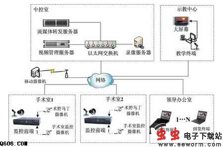 手术视频监控转播示教系统从结构上分为手术室子系统、手术教学子系统、交换控制中心子系统、网络子系统四个子系统,整体系统的结构如下图: