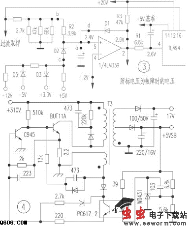 一台SLPS-250ATXC电源的输出电压偏低。空载下,+5V电源的电压只有+1.8V,其他各路电压也按比例同样下降。电源是采用TL494及LM339集成电路的典型ATX电路。检查494的{4}脚电压为+2.6V。电路似乎处于保护状态。但保护状态时各路输出的电压均应为零,而现在却是正常电压的三分之一,令人费解。试着把494的第{4}脚接地,电源立即输出正常。{4}脚接地就正常工作,说明494并未损坏,问题可能出在339以及有关的电路。用万用表查339管脚的电压,当查到第{4}脚及{7}脚时,各路电源均正常了。甚至只用一条表笔去碰{7}脚或{4}脚,也可使电源恢复正常工作。这等于在{4}脚或{7}脚上加了一条“天线”,天线接收了外来信号电源就工作正常了!我试了试天线的长度,40厘米以下对电源不起作用,长度增加了,输出电压也随着增加,达到1米左右时,输出电压就正常了,494的{4} 脚电压也恢复到0V。但电源要用“天线”才能工作,说明还有故障未找到。再检查339的{4}脚与{5}脚的电压,{5}脚电压为2.4V,{4}脚的电压为1.2V,输出端{2}脚的电压为2.9V。(这部分电路见图3)。但是339的{2}脚高电位,必须由{5}脚电位高于{4}脚的电位时才能产生,那{5}脚最初的高电位是怎么来的?把与{5}脚相连的各支路断开试一试 。在断开c支路以后,电源就正常了。沿着D2往下找,最后在+3.3V电源处对地接一个1000μF的电容时,电源就正常了。再检查+3.3V电源原来的滤波电容,发现已经失效。更换电容后? 494的{4}脚电压恢复正常,用表笔去碰触339的{4}脚或{7}脚也不起作用,问题得到了解决。为什么+3.3V电源的滤波电容失效会造成输出电压偏低?+3.3V电源在没有电容滤波时,输出的直流电源中含有很强的由逆变功率管输出的脉冲成分,通过D3及D2送到LM339的{5}脚,使{5}脚的电平高于{4}脚的电平,电源进入了保护状态。从+20V电源经R3、D1、R2和三个并联电阻到接地的支路中,三个电阻并联后的电阻值是2.43kΩ,再略去其他支路的影响,可以估算出 {5}脚的电压大约是2.3V,因二极管D1的钳位作用,{2}脚输出电压只能在2.9V左右,经R1送到TL494的{4}脚,减去电阻R1的降压,494的{4}脚电压就是2.6V了。在此电压下,494会输出较窄的脉冲,于是在空载下,+5V电源有约1.8V的电压输出。解决的办法可在d支路中串联一个47kΩ的电阻,并把R2由3.9kΩ换成100kΩ就行了。经这样处理后,不论是正常工作或是保护状态,各路电源的输出电压和各管脚的电压均正常了。而R2电阻的改动,也不会影响电源的过载保护性能。至此,电源的故障才完全得到了解决(爱好者手中若有SLPS-250ATXC电源,可参考此例加一个47kΩ电阻以提高电源的保护性能)。