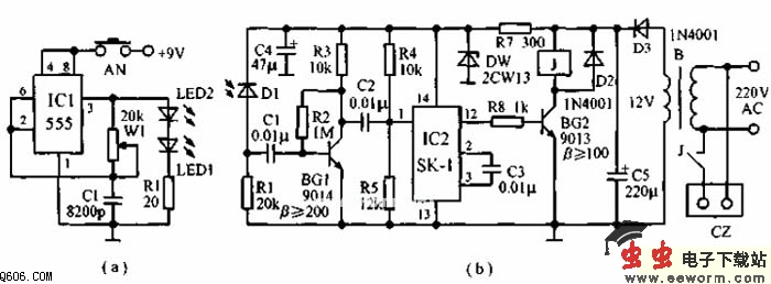采用声控电路BH-SK-I的红外遥控开关发电路如下图所示,发生器为555组成的多谐振荡器,产生的脉冲驱动经外发射二极管发出红外脉冲信号。接收管与发射管配对选用,它将红外光脉冲变为电信号,经BG1前置放大,触发IC2声控集成电路BH-SK-I。受触发后其12脚输出高电平,使BG2导通继电器吸合插座CZ得电。若关机,只需要按一下发生器的按钮AN,IC2内部触发器翻转,输出低电平,BG2截止,继电器释放,插座失电。