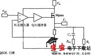 LDO稳压器的典型结构,如图1所示。图1中,Vref为具有良好温度特性的电压参考信号,Vin为不稳定的输入电压信号,Vo为输出电压信号。LDO稳压器利用由压差放大器、电压缓冲器、电压调整管Mpass和反馈网络构成的负反馈环路,维持Vo稳定。