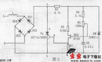 可控硅VS的触发脉冲靠一只简单的单结晶体管VS电路产生,电容器C2通过电阻R4、R5充电到稳压管DW的稳定电压UZ,当C2充电到单结晶体管的峰点电压时,单结晶体管就触发,输出脉冲而使可控硅导通。在单结晶体管发射极电压充分衰减后,单结晶体管就断开,VS一经接通,那么a、b两点之间的电压就下降到稳压管DW的稳定电压UZ以下,电容器C2再充电就依赖于点a到b点间的电压,因稳压管的电压已经降低到它的导通区域以外,点a到b点的电压取决于电动机的电流、R1和VS导通时的电压降。这样,当VS 导通时,电容器C2的充电电流取决于电动机的电流,在这种情况下便得到了反馈,这就使得电动机在低速时转矩所受损失的问题得到补救。