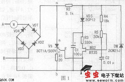 硅二极管VD1~VD4构成一个桥式全波整流电路,电桥与电机串联在电路中,电桥对可控硅VS提供全波整流电压。当VS接通时,电桥呈现本电机串联的低阻电路。当图1中A点为负半周时,电流经电机、VD1、VS、R1、VD3构成回路,当B 点为正半周时电流经VD2、VS、R1、VD4、电机M构成回路,电机端得到的是交变电流。电机两端的电压大小主要决定于可控硅VS的导通程度,只要改变可控硅的导通角,就可以改变VS的压降,电机两端的电压也变化,达到调压调速的目的,电机端电压Um=U1-UVD1-Uvs-UR1-UVD3,上式中,UVD1、UVD3的压降均很小,而反馈UR1也不大,故电机端电压就简化为Um=U1-Uvs。