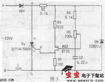 R3是作单结晶体管温度补偿之用,当R3增大时,温度特性就要好一些,本电路也适用于可逆电机调速之用,负载端电压调节范围从35~215V连续可调。若负载为电机或电磁振动线圈,它不要求对转矩进行补偿,则电路可以进一步简化,电路如图2所示,其工作原理同图1,输出电压主调节范围是35~215V,R1的作用是保证VS输出脉冲的幅度,R1增大,则输出脉冲也增加,若作调光,则可将负载改作灯泡即可。