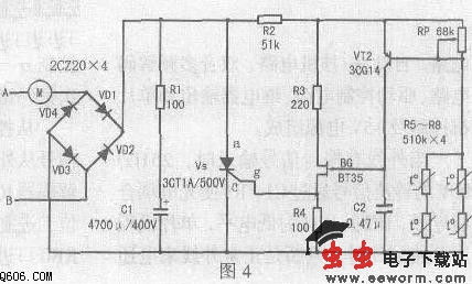 若负载电压最大值不需要很高,则可将桥式整流电路改为半波整流,其输出至负载的电压调节范围为30~100V,其工作原理同前。电原理图如图3所示。风扇调速电路如图4所示,电路采用了热敏电阻,当环境温度上升或下降时,其电阻值发生变化,导致VT2的不断变化,使可控硅导通角前后移动,改变电扇两端的电压,风扇电机的转速即随之变化。当环境温度上升时,电风扇转速高,反之则低。