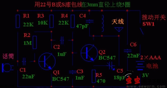 故此,Q2在此形成一个振荡,产生88MHz的交流讯号。放大后之音频讯号经0.1uF电容溃入到!Q2之基极,改变振荡频率,产生所需的FM讯号。